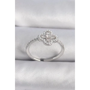 Pirinç Gümüş Renk Zirkon Taşlı Yonca Model İnci Detay Kadın Yüzük