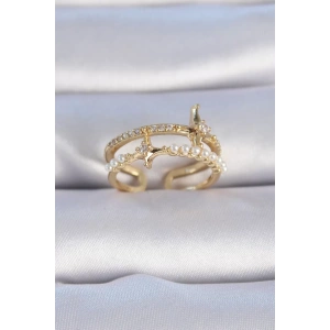 Pirinç Gold Renk Zirkon Taşlı İnci Detay Kutup Yıldızı Model Kadın Yüzük