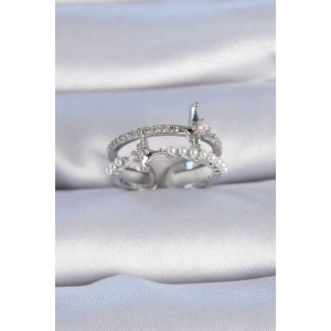 Pirinç Gümüş Renk Zirkon Taşlı İnci Detay Kutup Yıldızı Model Kadın Yüzük