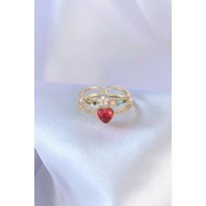 Gold Renk Kırmızı Zirkon Taş Kalp Model Pirinç Kadın Yüzük