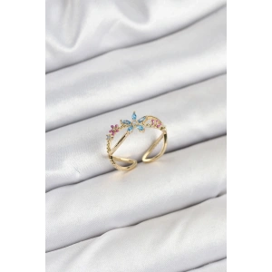Pirinç Gold Renk Zirkon Taşlı Mavi Çiçekli Kadın Yüzük