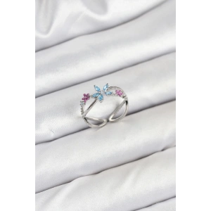 Pirinç Gümüş Renk Zirkon Taşlı Mavi Çiçekli Kadın Yüzük