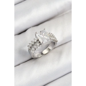 Pirinç Zirkon Taşlı Dikdörtgen Model Gümüş Renk Kadın Yüzük