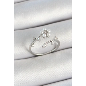 Pirinç İnci Detaylı Papatya Figürlü Zirkon Taşlı Gümüş Renk Ayarlanabilir Kadın Yüzük