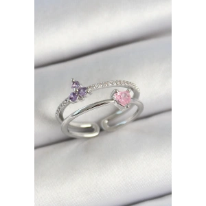 Pirinç Kalp Ve Çiçek Figürlü Zirkon Taşlı Gümüş Renk Ayarlanabilir Kadın Yüzük