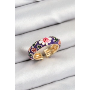 Pirinç Mor Mineli Çiçek Motifli Gold Renk Ayarlanabilir Kadın Yüzük