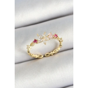 Pirinç Fuşya Mineli Çiçek Motifli Gold Renk Ayarlanabilir Kadın Yüzük