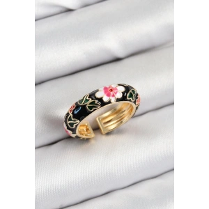 Pirinç Siyah Mineli Çiçek Motifli Gold Renk Ayarlanabilir Kadın Yüzük